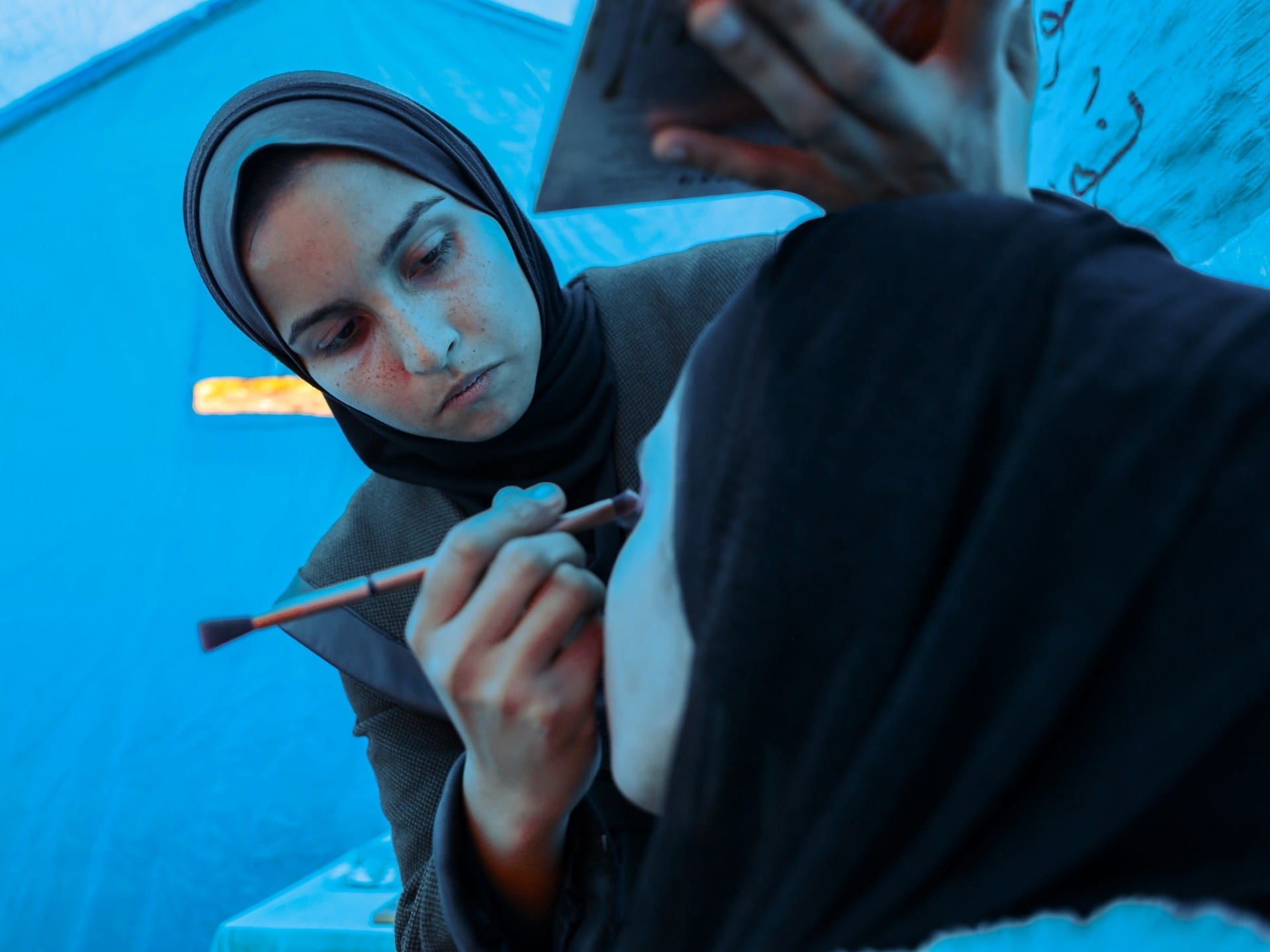 The salon is a small blue tent that has a single table with damaged mirrors, depression tools, moisturizers and some makeup.