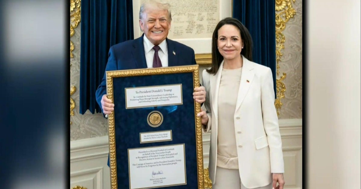 Venezuelan opposition leader María Corina Machado met with President Trump at the White House on Thursday. He presented Mr Trump with a Nobel Peace Prize medal, seen as a peace offering to win his support. The President has repeatedly said that he should have been given a medal. Nancy Cordes reports.